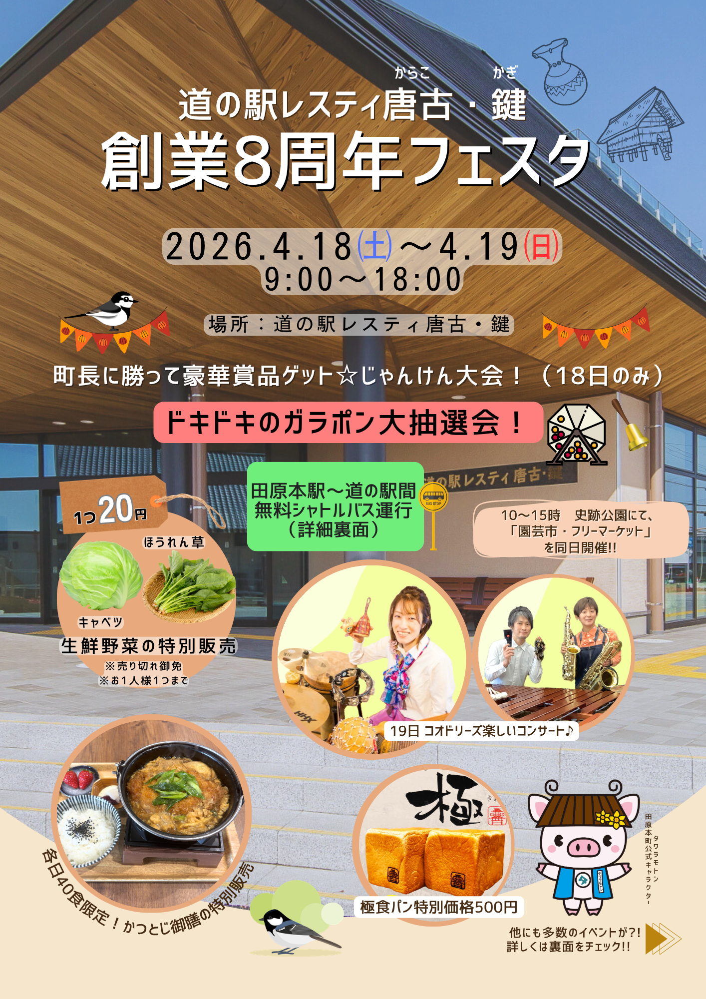 - 2025年3月31日4月19日(土)・20日(日)に道の駅レスティ唐古・鍵「創業7周年フェスタ」を開催します。生鮮野菜の特別販売やガラガラ抽選会、クラシックコンサートや猿回し公演など、楽しいイベントを多数ご用意しております。皆様のご来場をお待ちしております!(^^)!