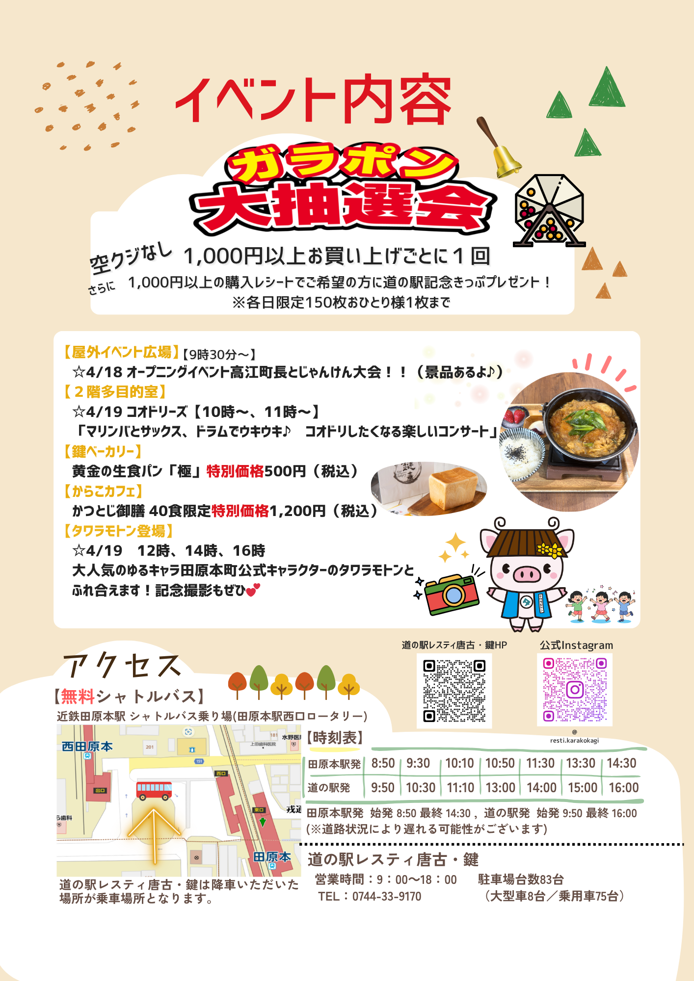 4月18日(土)・19日(日)に道の駅レスティ唐古・鍵「創業8周年フェスタ」を開催します。生鮮野菜の特別販売やガラガラ抽選会、コオドリーズによる楽しいコンサートなど、楽しいイベントを多数ご用意しております。皆様のご来場をお待ちしております!(^^)!
